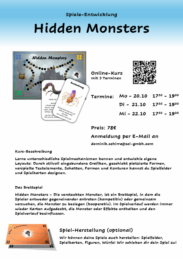 Entwickle Spielfelder, designe Spielkarten und gestallte Spielmarker: Jedes Spiel wird anders aufgebaut, besteht aus anderen Spielmaterialien und Spielmechanismen. Lerne die Spiele kennen und entwickle deine eigenen Brettspiele. Wenn du willst, stellen wir dein Spiel anschließend für dich her!
