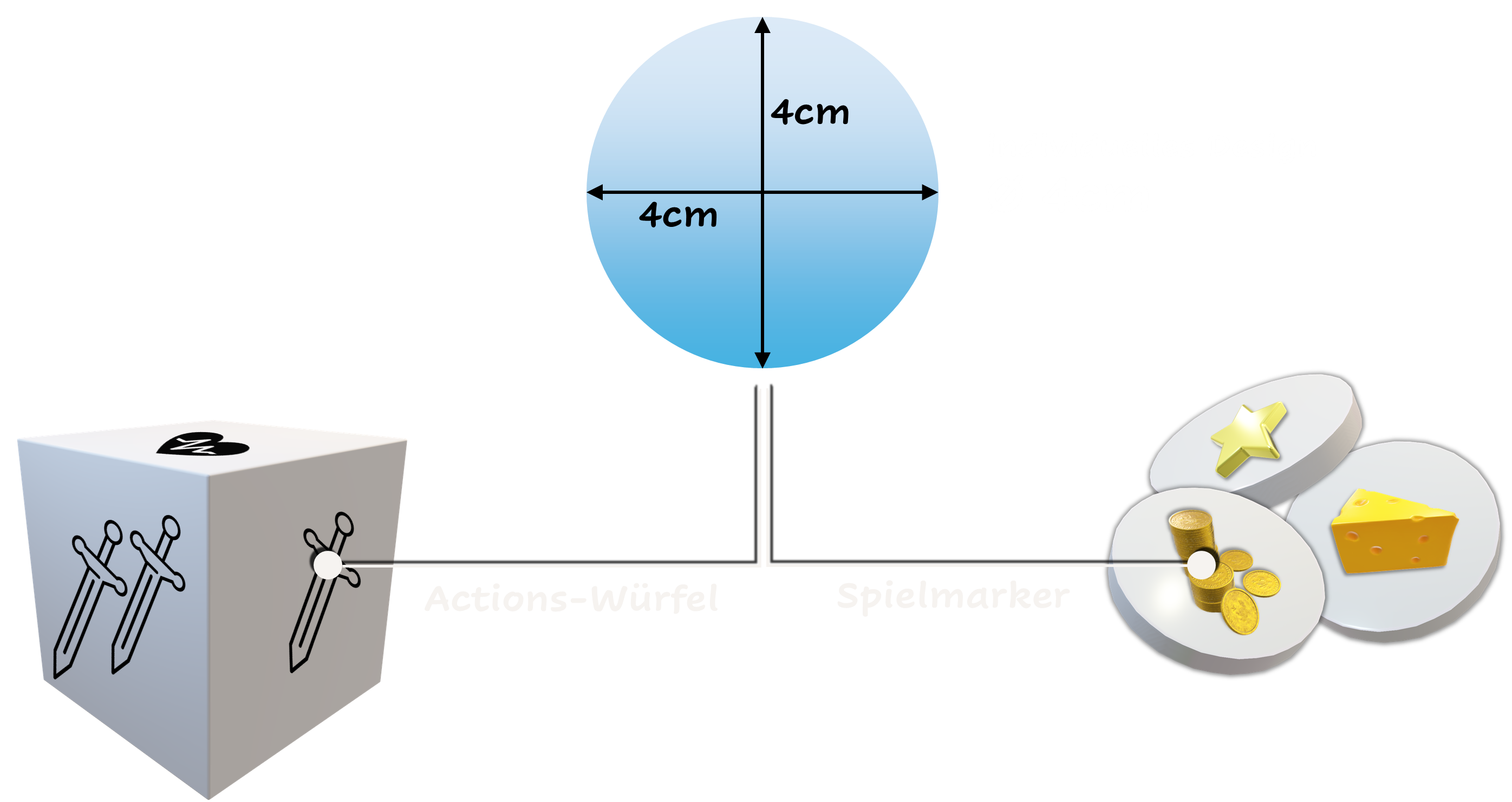 Die Layouts für Würfel und Spielmarke sind rund und haben einen Durchmesser von 4cm: Passe die Spielmaterialien deinem Spiel an!